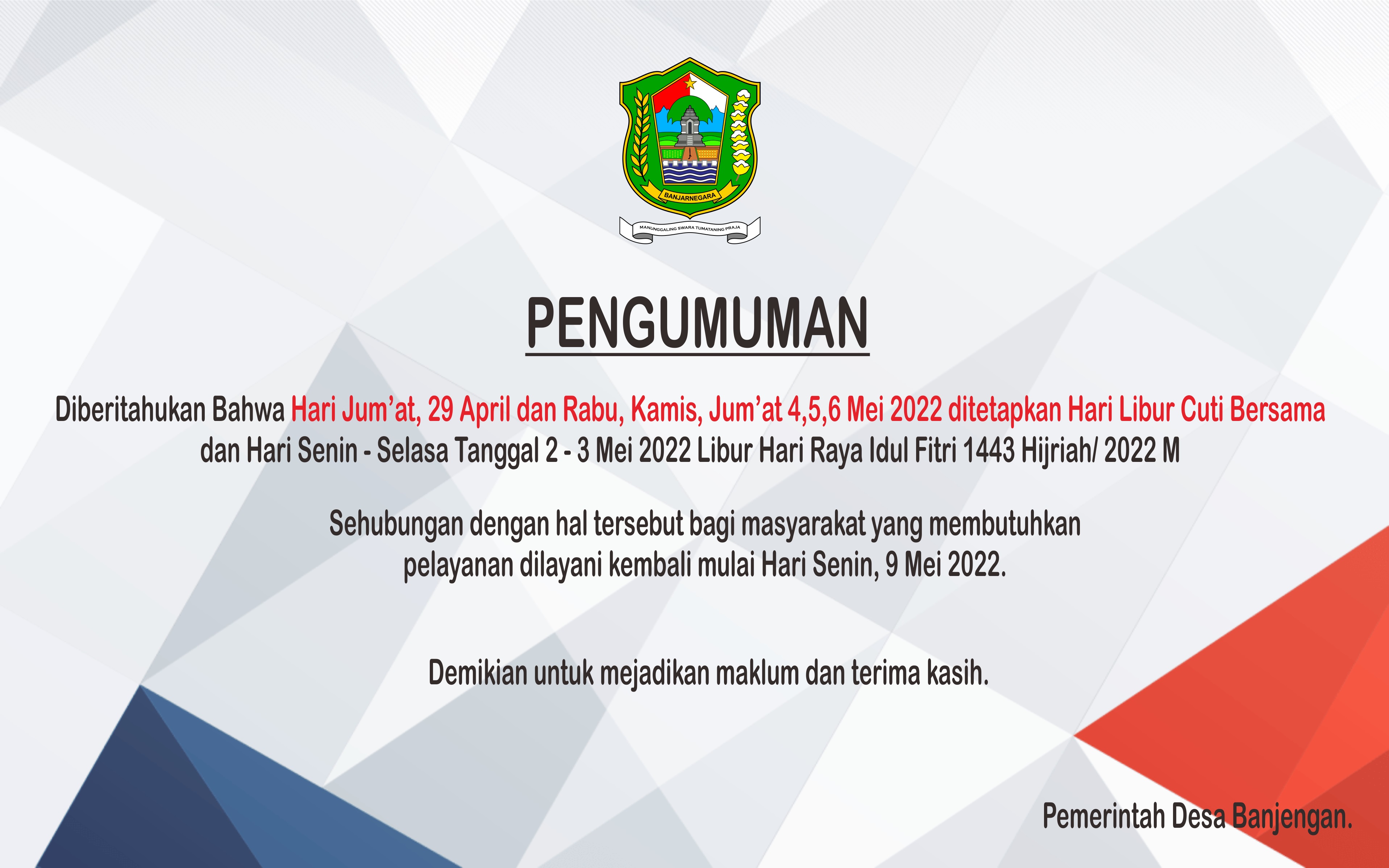 Diberitahukan Bahwa Hari Jum’at, 29 April dan Rabu, Kamis, Jum’at 4,5,6 Mei 2022 ditetapkan Hari Libur Cuti Bersama